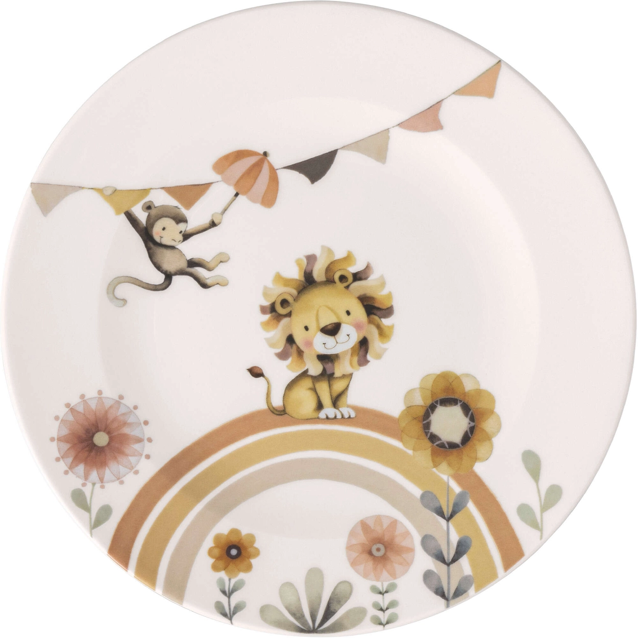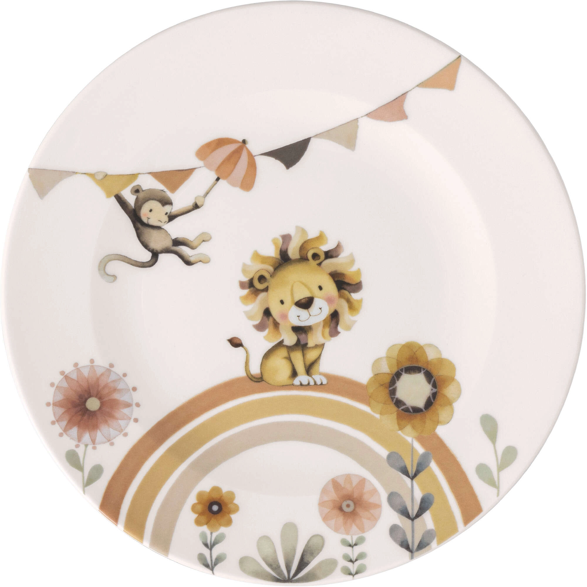 Talerzyk płaski z kolekcji z kolekcji Roar Like A Lion. Kolekcja Roar Like A Lion to nowa odsłona porcelany stworzonej z myślą o najmłodszych! W tym wydaniu główną rolę odgrywa uroczy lew, tęcza, małpka i kwiaty - utrzymany w trendzie i kolorystyce boho. Kolekcje dziecięce są specjalnie dostosowane pod względem rozmiarów, kształtów i materiałów dla maluchów! Zastawa składa się z talerzy płaskich i głębokich, miseczki, kubeczków w dwóch rozmiarach i sztućców. Od teraz każdy posiłek będzie także świetną zabawą!