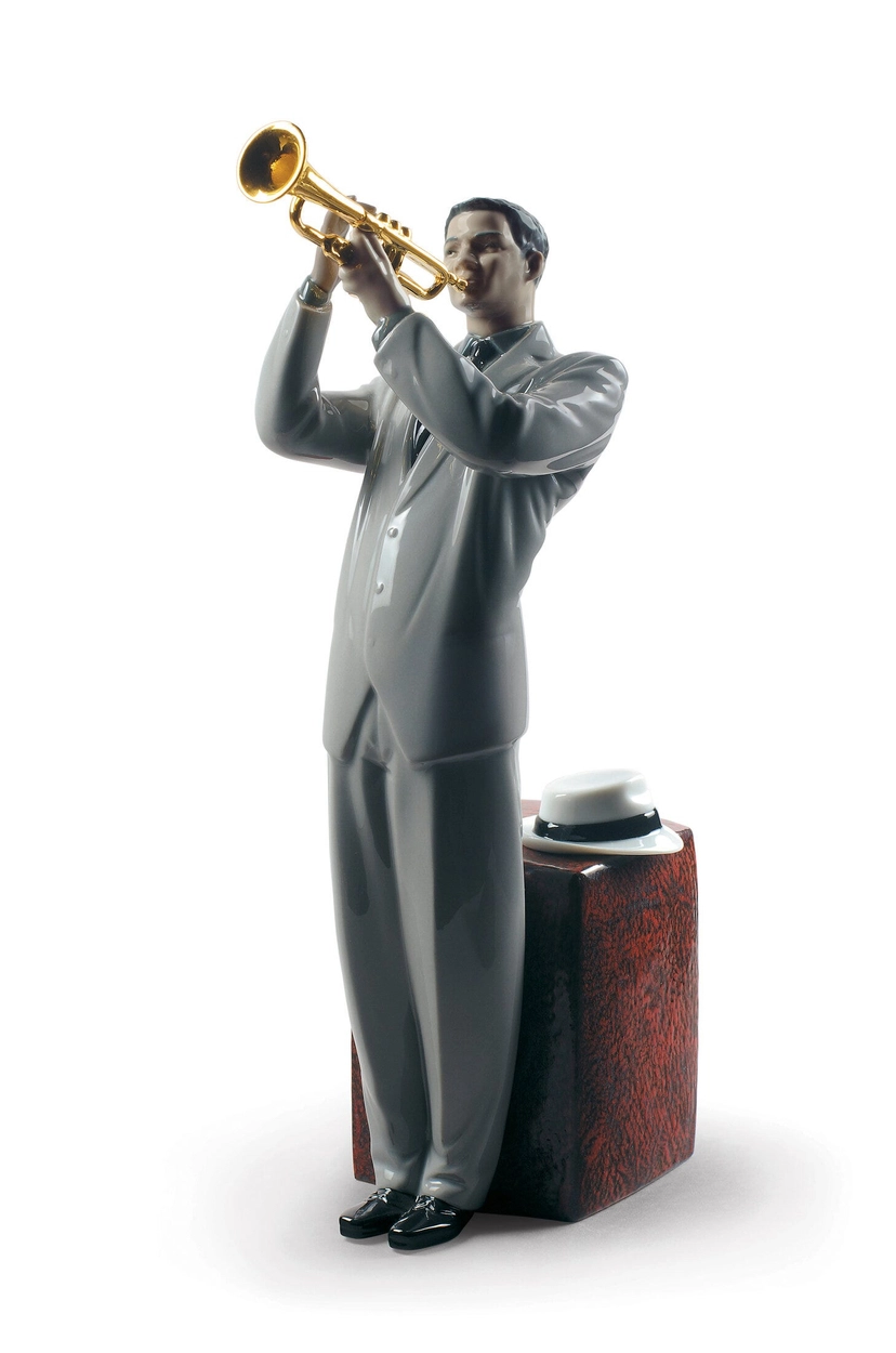 - Figurka trębacza jazzowego w klasycznym ubraniu ze złotą trąbką.