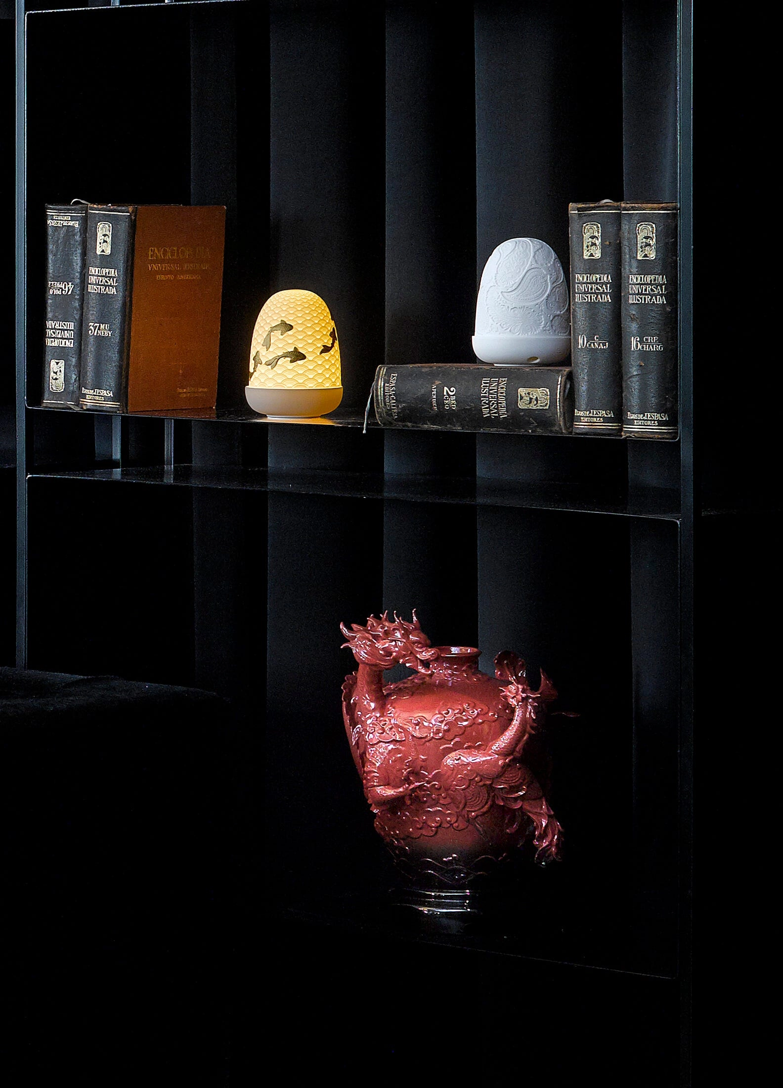 - Wazon z czerwonej porcelany ze smokiem i feniksiem na czarnej podstawie.