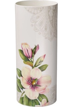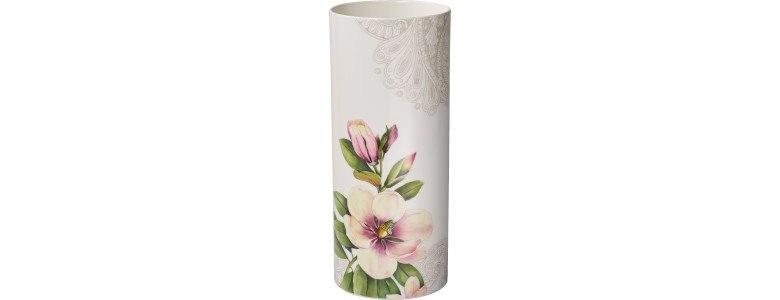 Wazon wysoki z kolekcji Quinsai Garden Gifts. Kolekcja Quinsai Garden to połączenie eleganckiej, wysokojakościowej porcelany z kwiatowymi motywami. Kształt naczyń znany z serii Modern Grace to nowoczesna odsłona klasycznej zastawy, która sprawi, że Twój stół nabierze nowego, zachwycającego wyglądu. Cała kolekcja inspirowana jest podróżą Marco Polo do Chin i miastao portowego Quincy, dziś Hangzhou. Podróżnik zachwycony "niebiańskim miastem" określił je jako najpiękniejsze. Marka Villeroy&Boch przeniosła azjatyckie kwiatowe motywy widziane przez Marco Polo wprost na białą porcelanę najwyższej jakości. Na elementach zastawy możemy zobaczyć cztery różne kwiaty - piwonie, która symbolizuje bogactwo, camellię oznaczającą hojność, chryzantemę uważaną za symbol odwagi i długiego życia oraz magnolię. Dopełnieniem są piękne, jednobarwne wzory typy paisley, które wraz z kwiatami tworzą niesamowitą dekorację porcelany. Przenieś się do azjatyckich miast pełnych kwiatów z porcelaną Villeroy&Boch!