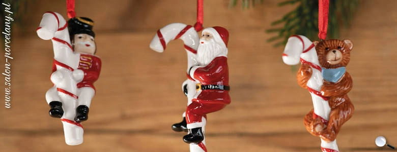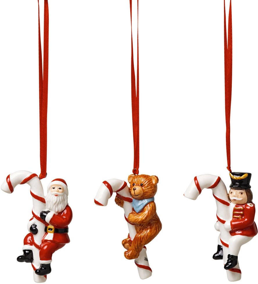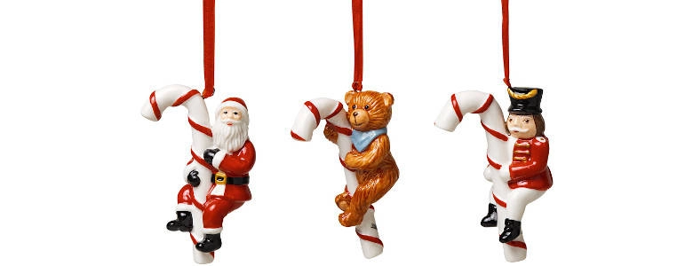 Zawieszki porcelanowe ze św. Mikołajem, misiem oraz Dziadkiem do orzechów na cukrowych laseczkach z kolekcji Nostalgic Ornaments. Kolekcja Nostalgic Ornaments to wyjątkowe uzupełnienie bożonarodzeniowych serii Villeroy&Boch. Składa się z dekoracyjnych zawieszek na choinkę, które zachwycają dbałością o detale. Zestawy porcelanowych ozdób pozwalają na wyjątkowe udekorowanie choinki. Zachwyć domowników i gości oryginalnym i przepięknym wystrojem. Nowe motywy świąteczne w postaci małych misiów czy prezentów przywołują cudowne wspomnienia z dziecięcych lat.