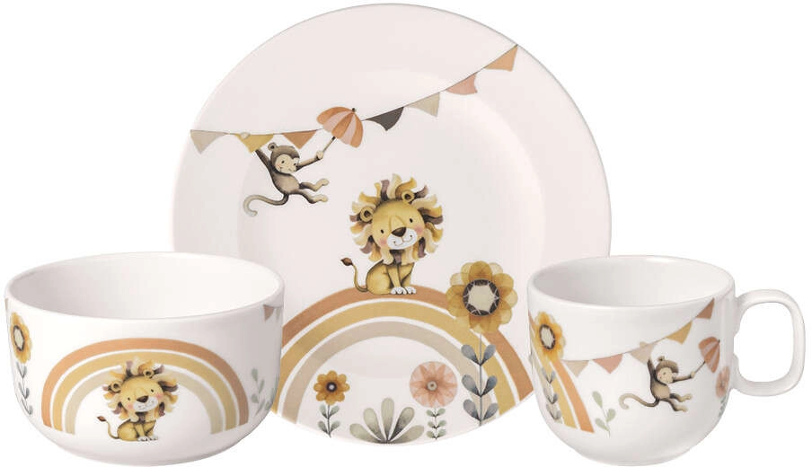 Zestaw dziecięcy 3 el. z kolekcji Roar Like A Lion. W skład zestawu wchodzi - talerzyk płaski, miseczka i mały kubek. Kolekcja Roar Like A Lion to nowa odsłona porcelany stworzonej z myślą o najmłodszych! W tym wydaniu główną rolę odgrywa uroczy lew, tęcza, małpka i kwiaty - utrzymany w trendzie i kolorystyce boho. Kolekcje dziecięce są specjalnie dostosowane pod względem rozmiarów, kształtów i materiałów dla maluchów! Zastawa składa się z talerzy płaskich i głębokich, miseczki, kubeczków w dwóch rozmiarach i sztućców. Od teraz każdy posiłek będzie także świetną zabawą!