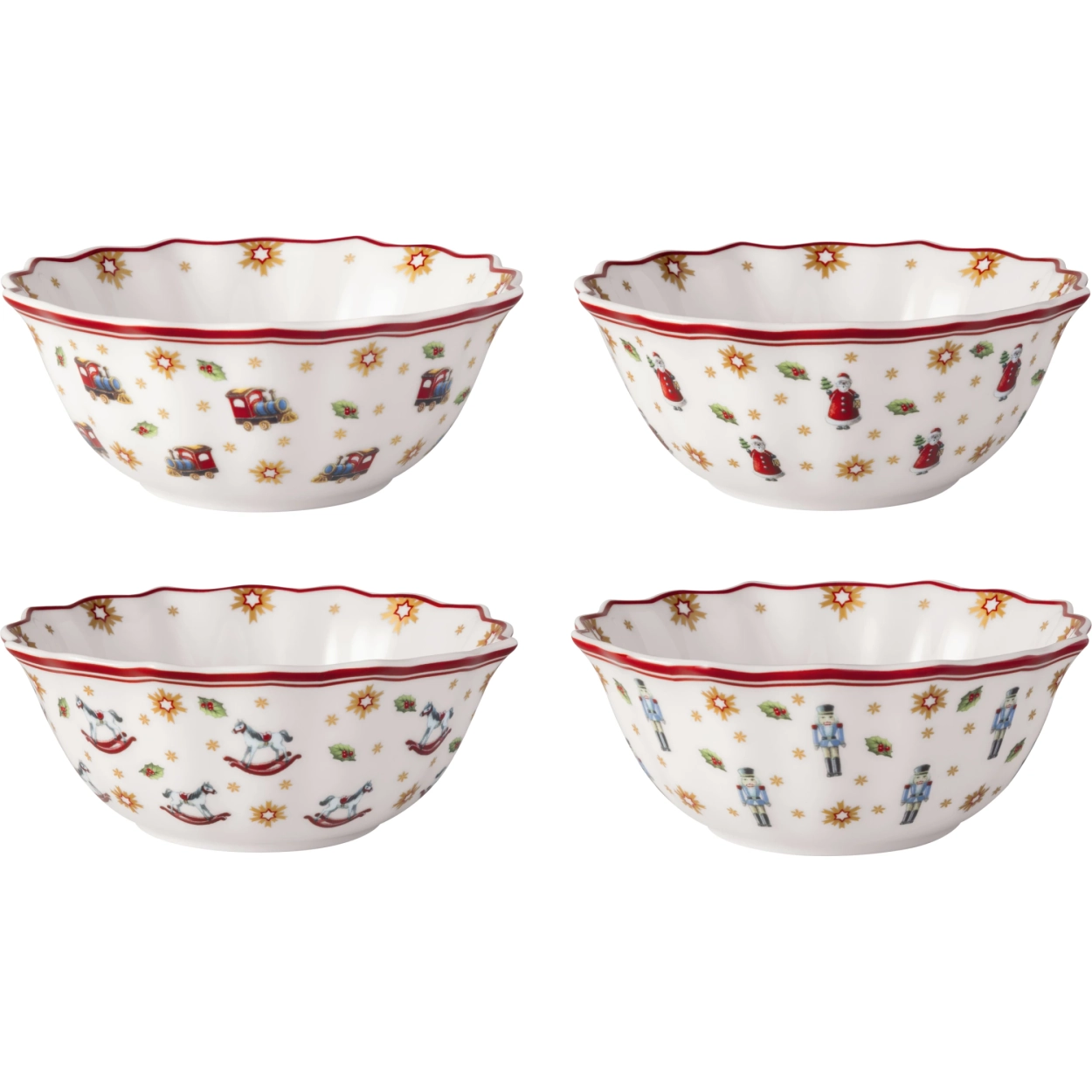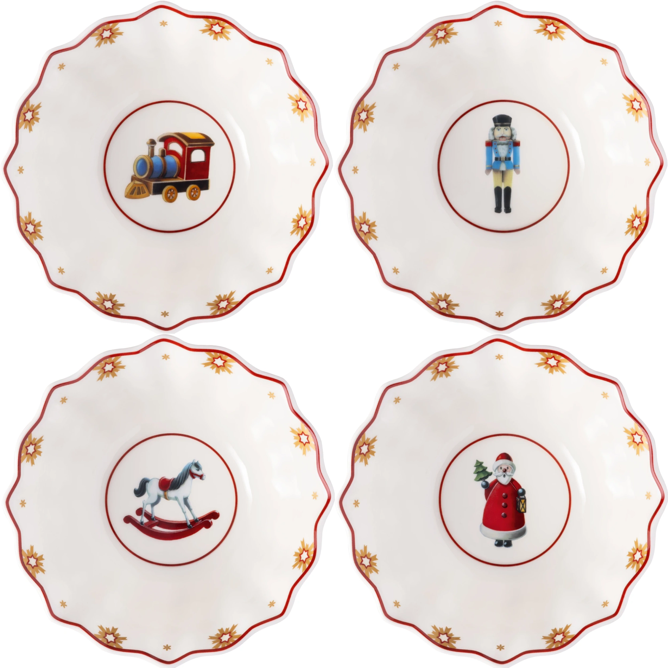 Zestaw 4 porcelanowych misek Anniversary z kolekcji Toy's Delight od Villeroy & Boch. Od 15 lat kolekcja Toy’s Delight zachwyca miłośników świąt na całym świecie, łącząc tradycyjne bożonarodzeniowe motywy z elegancją porcelany premium. Z okazji jubileuszu Villeroy & Boch prezentuje ekskluzywne poddekoracje na talerzach, kubkach i miseczkach, a także nowe, stylowe dodatki – od szklanego dzbanka po aromatyczną świecę cynamonową. To doskonała okazja, by stworzyć niezapomnianą, świąteczną atmosferę w swoim domu!
