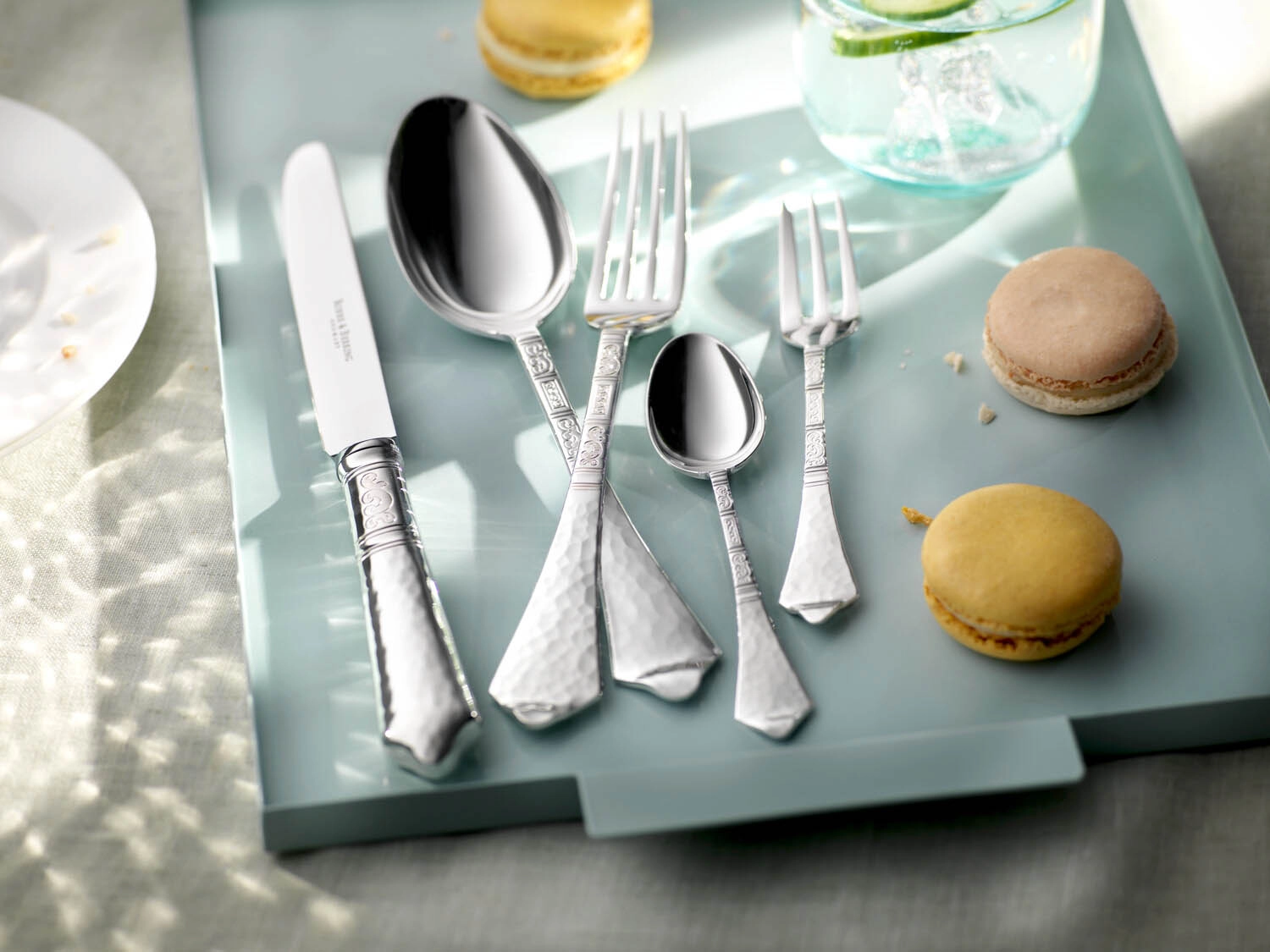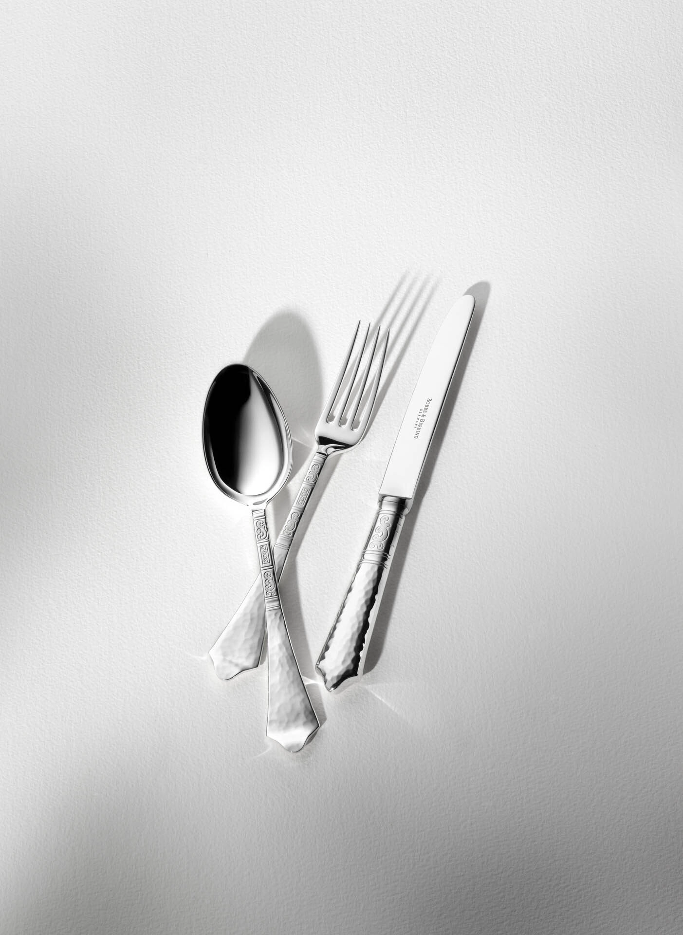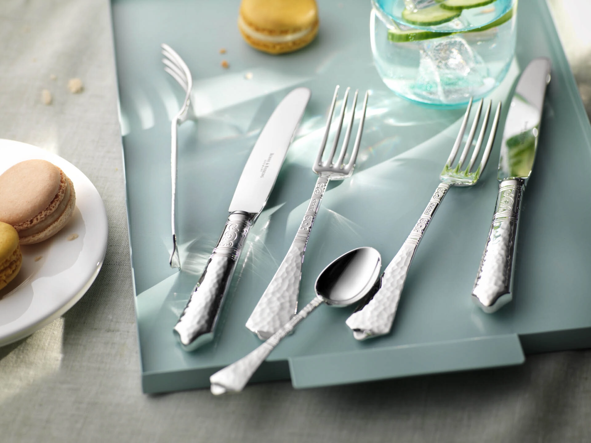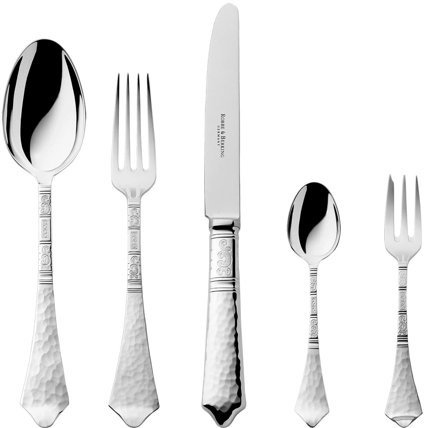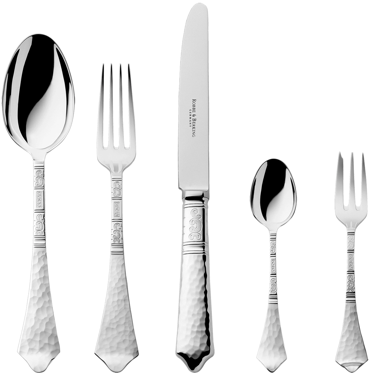 Zestaw posrebrzanych sztućców 30 el. dla 6 osób z kolekcji Hermitage 150. W jego skład wchodzi 6 x łyżka obiadowa (menu), 6 x widelec obiadowy (typu menu), 6 x nóż obiadowy (typu menu), 6 x łyżeczka do kawy i 6 x widelec do ciasta. Rozmiar menu gwarantuje większą wygodę użytkowania niż klasyczne sztućce stołowe. W 2014 roku Robbe & Berking, 140 lat po otwarciu pierwszego warsztatu złotniczego, przywrócił klasykę w postaci jubileuszowych sztućców Hermitage, należących do najstarszych i najpiękniejszych kolekcji tej renomowanej fabryki. Wyjątkowość jest widoczna w każdym detalu - złotnicy nadają sztućcom niepowtarzalne wykończenie, co sprawia, że każdy egzemplarz jest unikatowy.