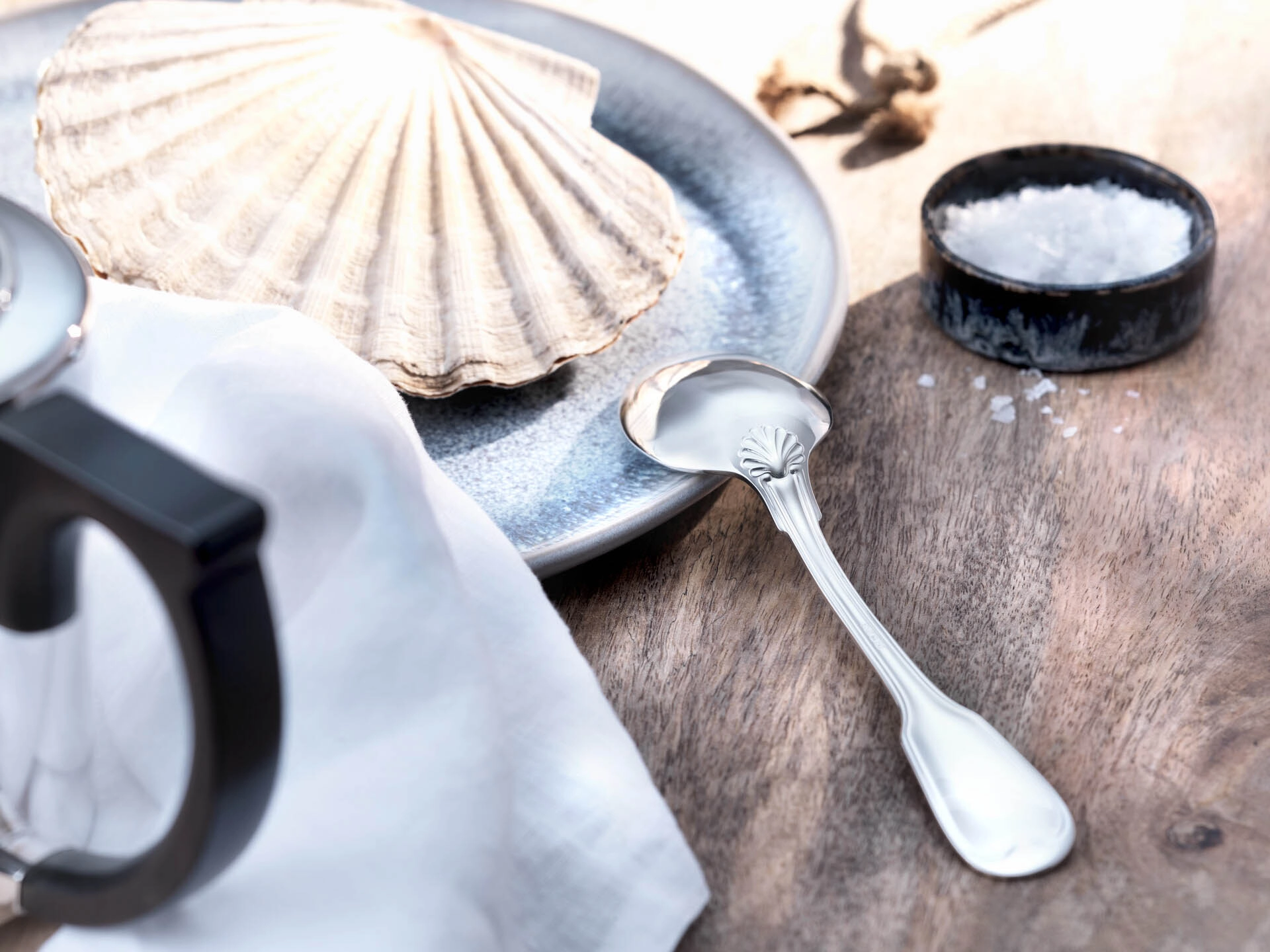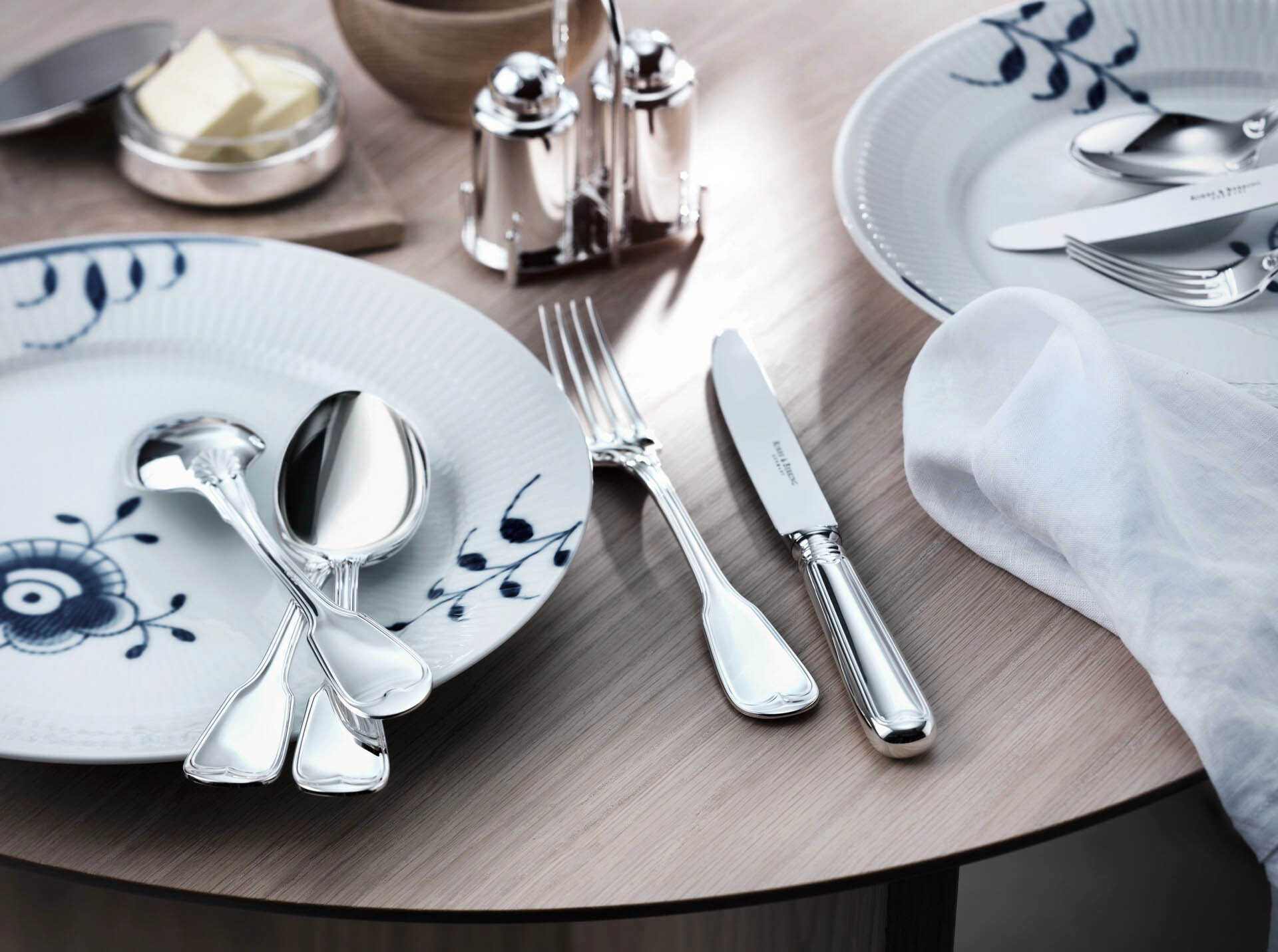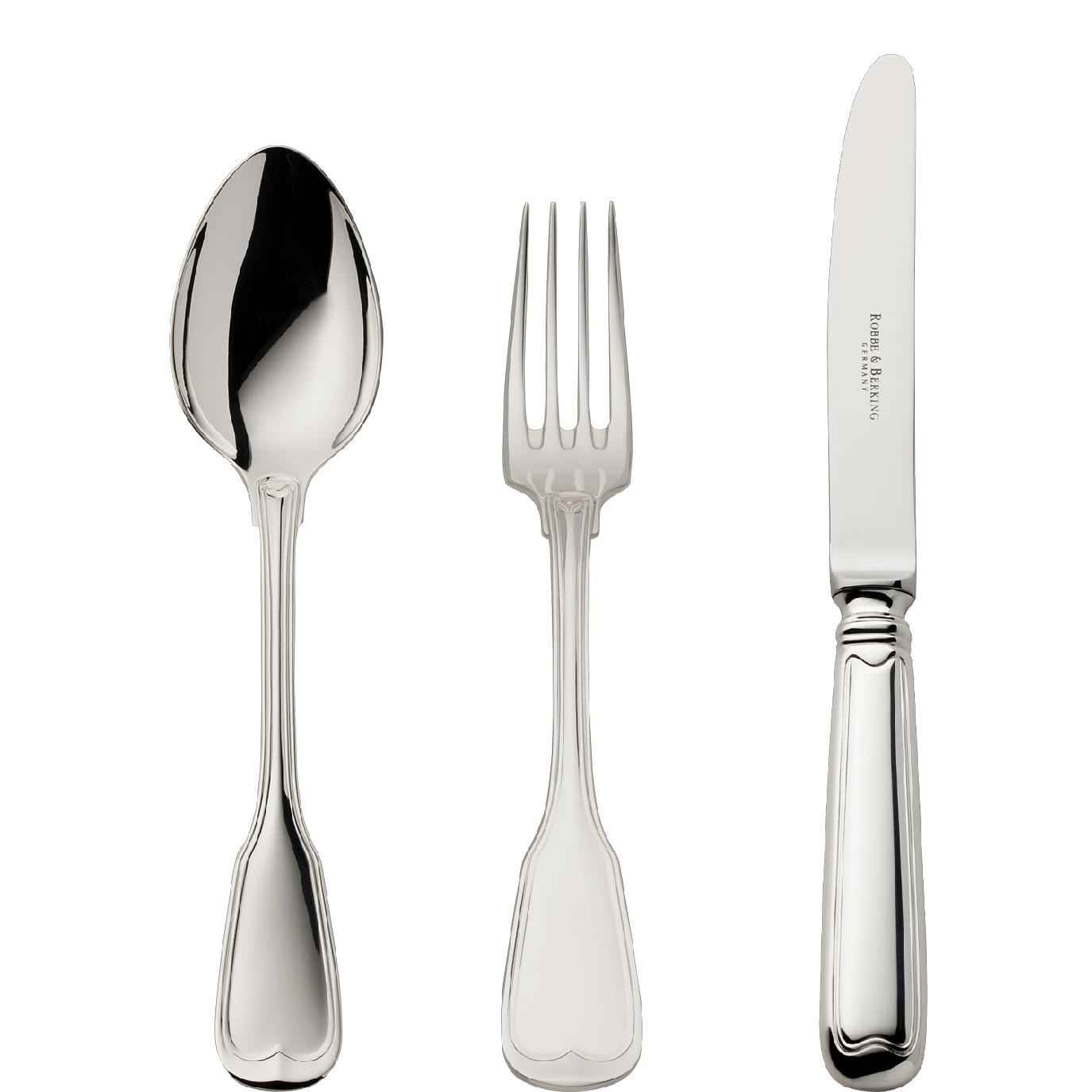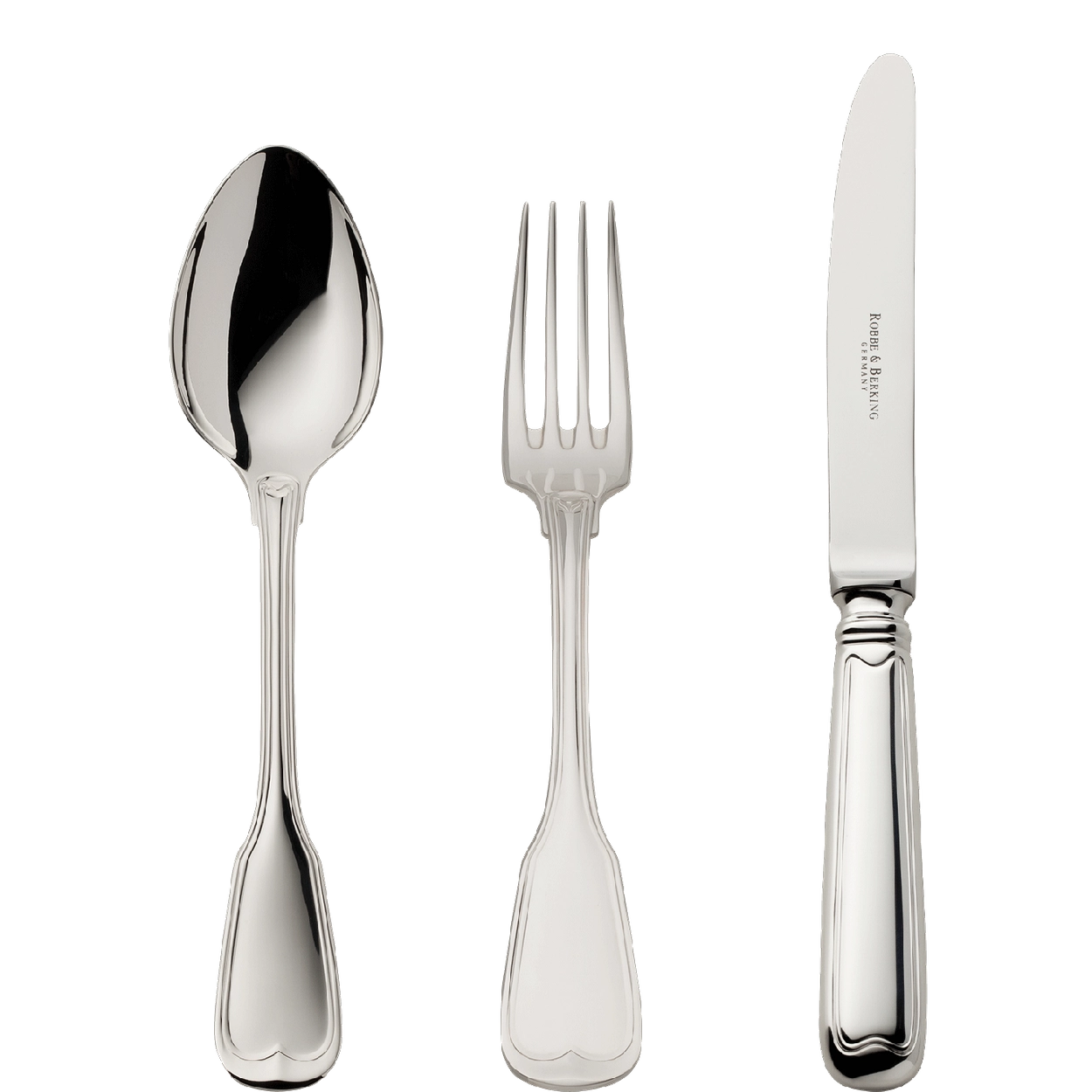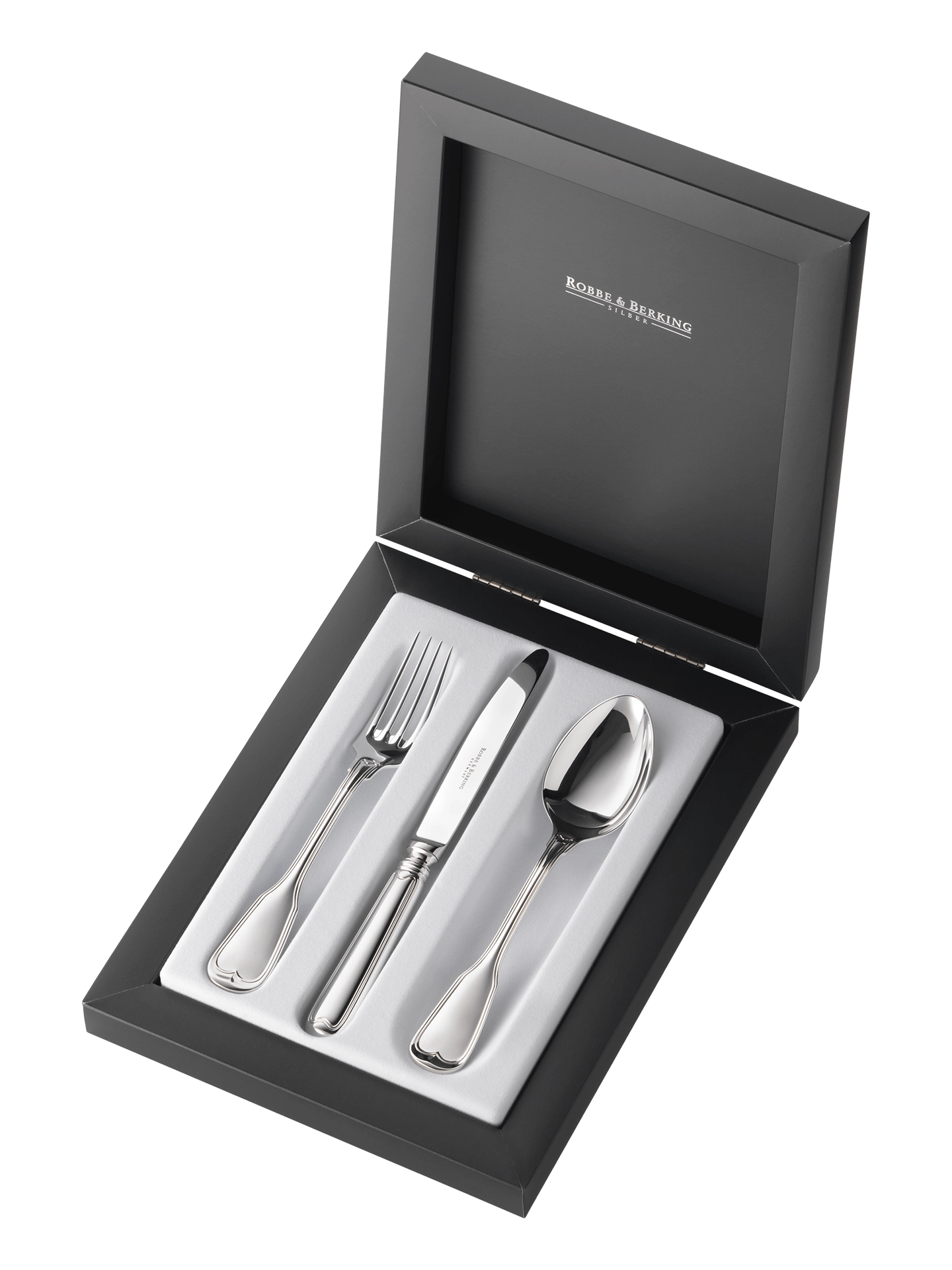 Zestaw posrebrzanych sztućców dziecięcych 3 el. z kolekcji Alt-Faden 150. W skład zestawu wchodzi łyżka, widelec i nóż przystosowane dla najmłodszych. Srebro od dawna znane jest ze swoich właściwości antybakteryjnych, dlatego też sztućce dla dzieci marki Robbe & Berking zapewniają niezwykłą higienę. Taki zestaw to nie tylko praktyczny wybór, ale także elegancki prezent z okazji narodzin, chrztu lub urodzin. Alt-Faden firmy Robbe & Berking to wzór, który jest rozpoznawany przez eskpertów na całym świecie. Ten unikalny wzór, oparty na złotnictwie augsburskim z pojedynczą lub podwójną srebrną nicią jako obramowaniem, sięga około 1760 roku. Powtórzona nitka z tyłu, zakończona w kształcie muszelki, jest uznawana za podpis marki.