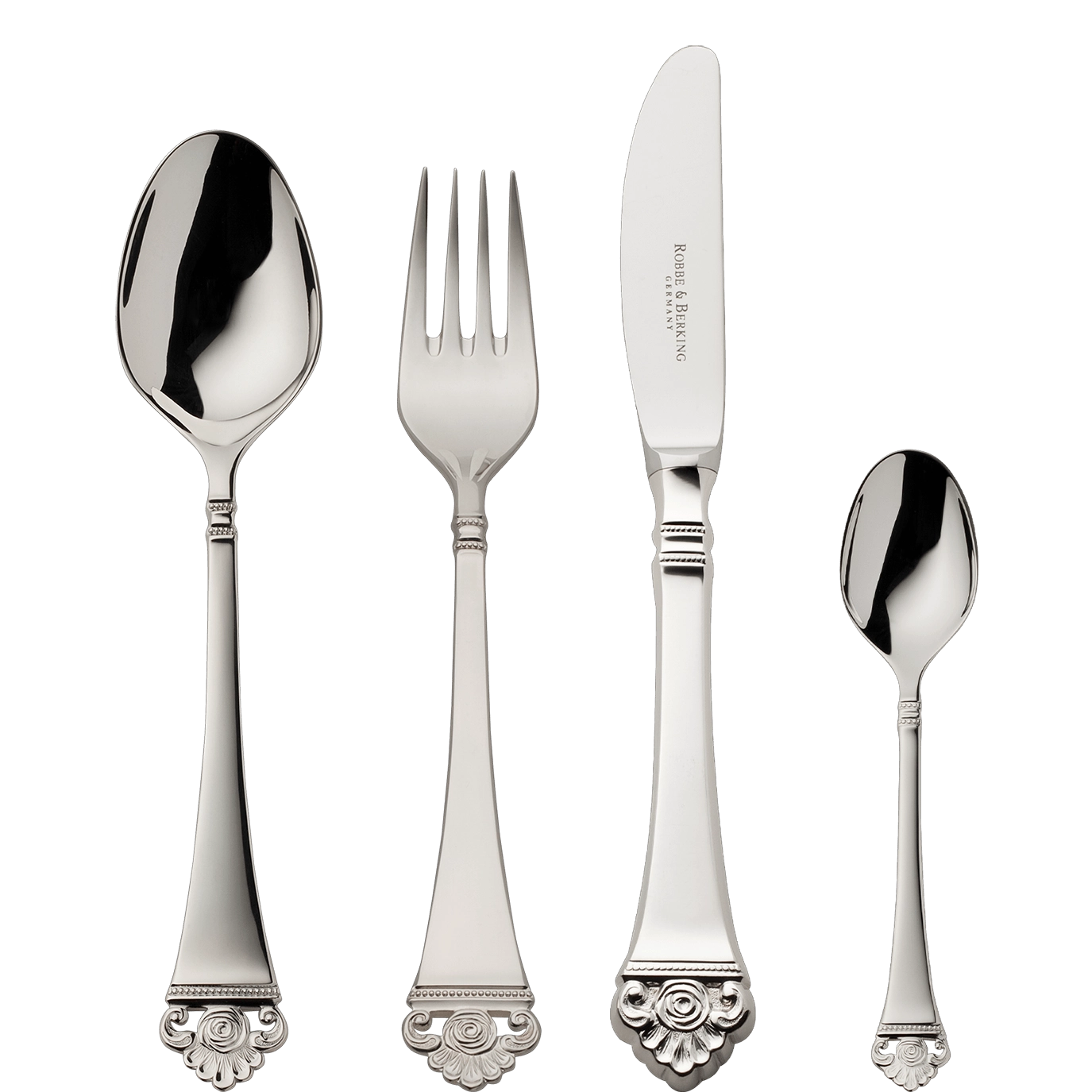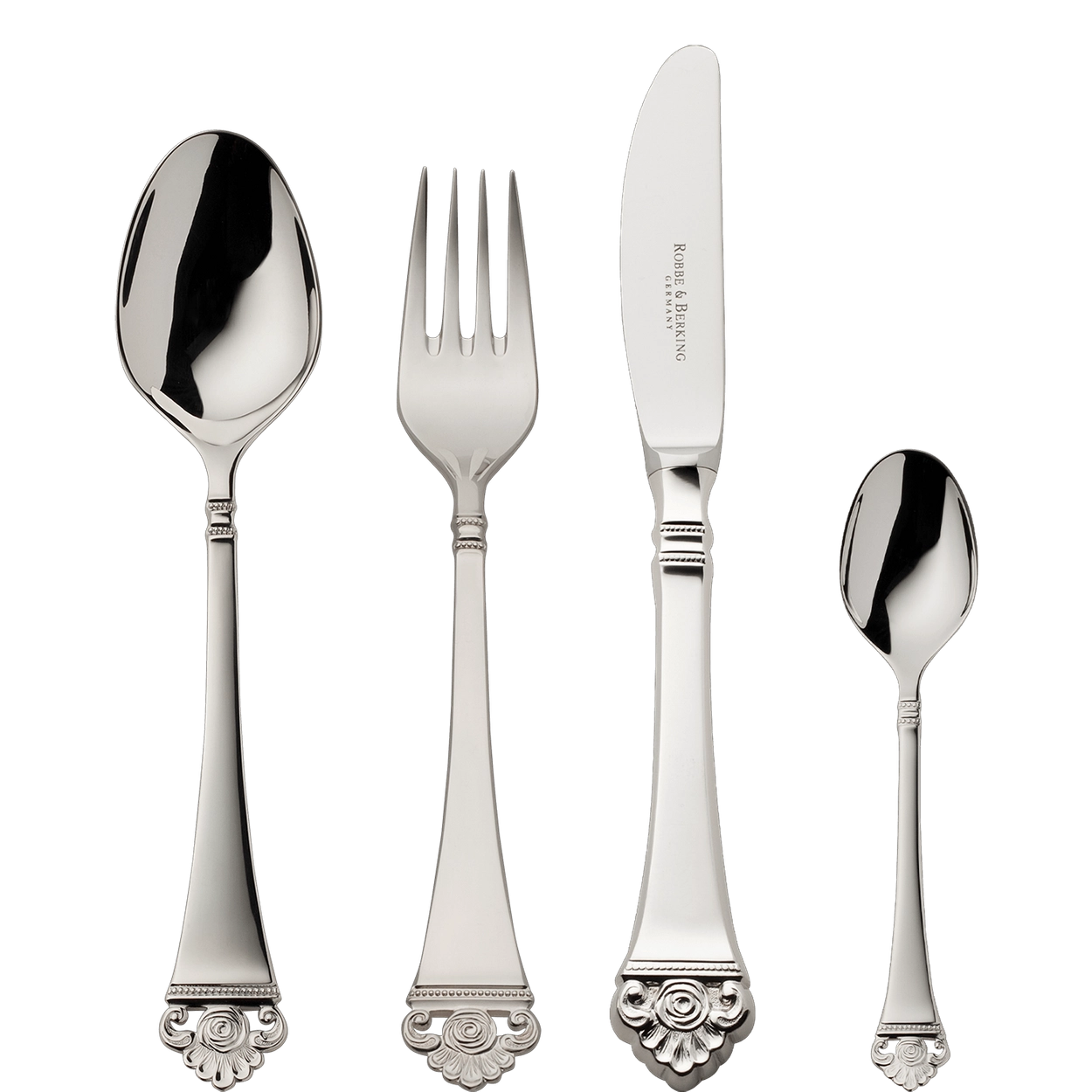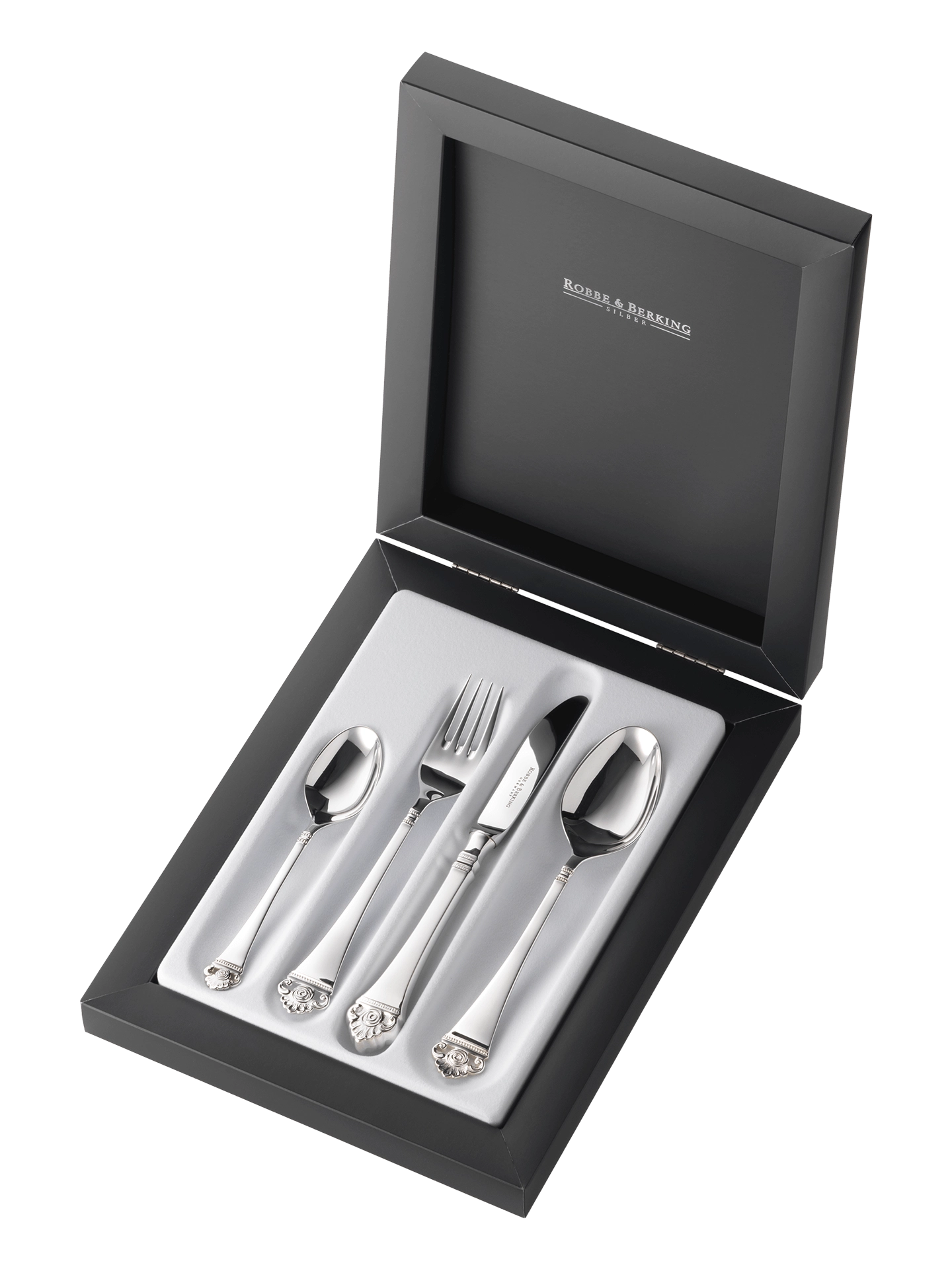 - Zestaw posrebrzanych sztućców dziecięcych 4 el. ze złoceniem z kolekcji Rosenmuster Goldband 150
